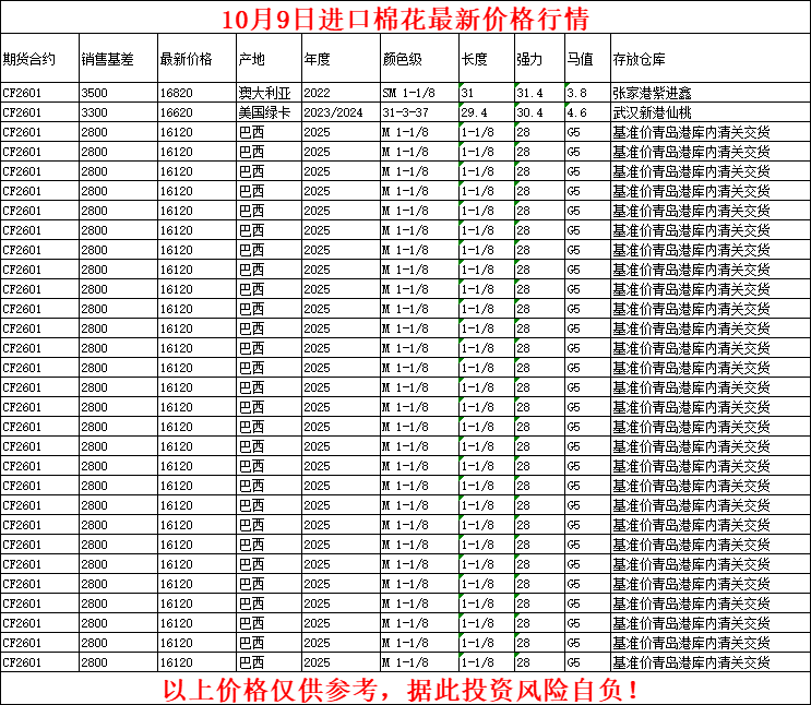 10月9日进口棉花价格行情