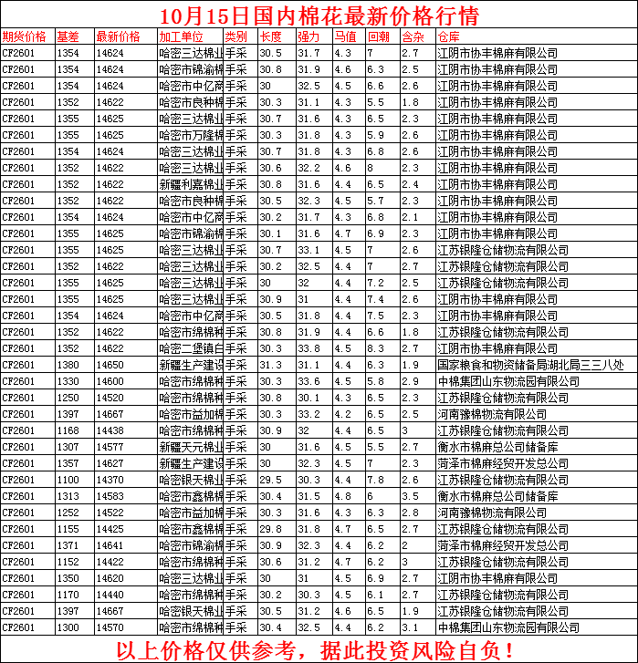 核心提示:10月15日国内棉花价格行情