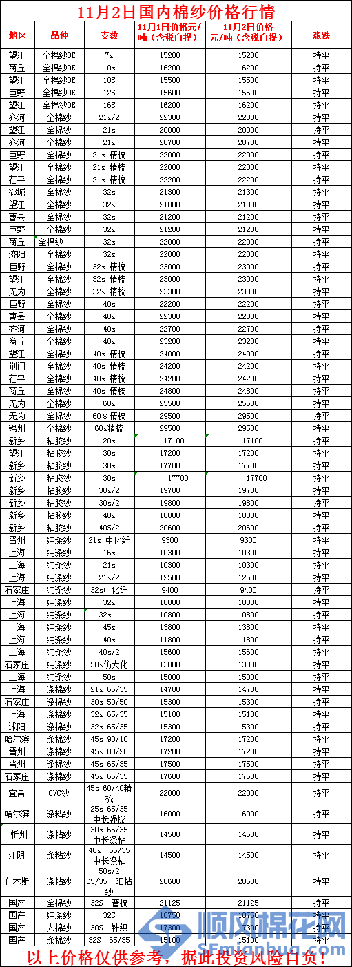 核心提示:11月2日国内棉纱价格行情