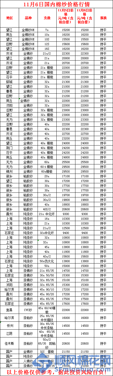 核心提示:11月6日国内棉纱价格行情