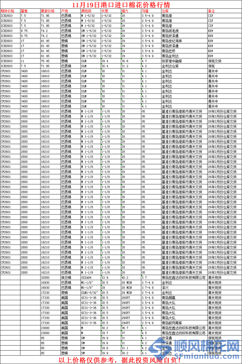 核心提示:11月19日港口进口棉花价格行情