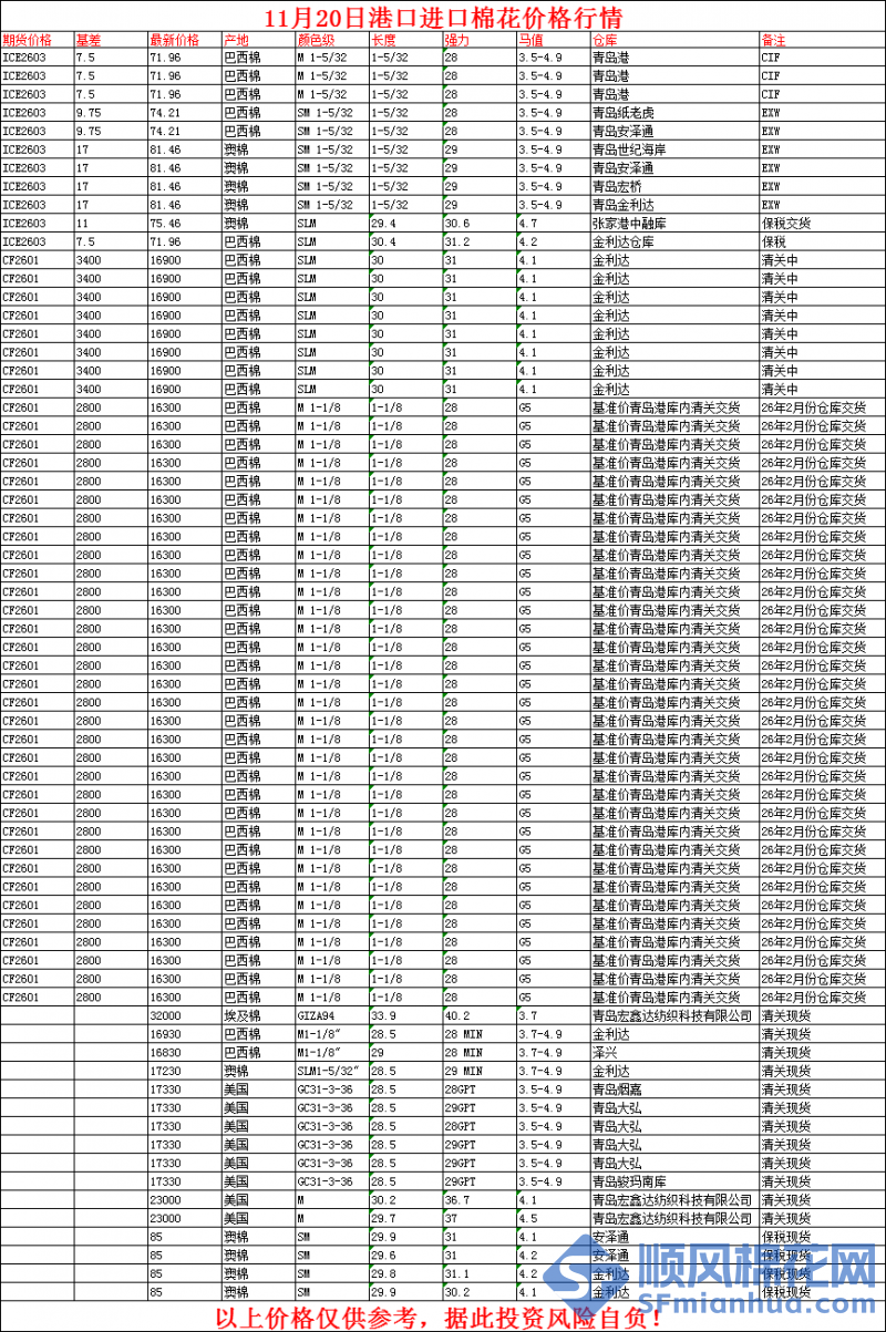 核心提示:11月20日港口进口棉花价格行情