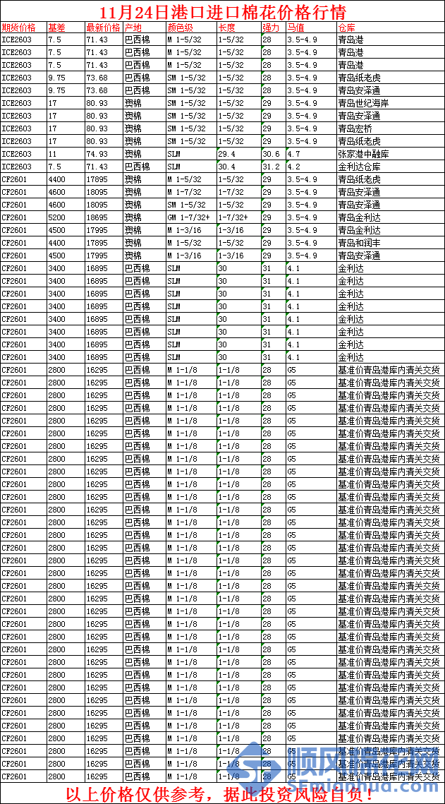核心提示:11月24日港口进口棉花价格行情