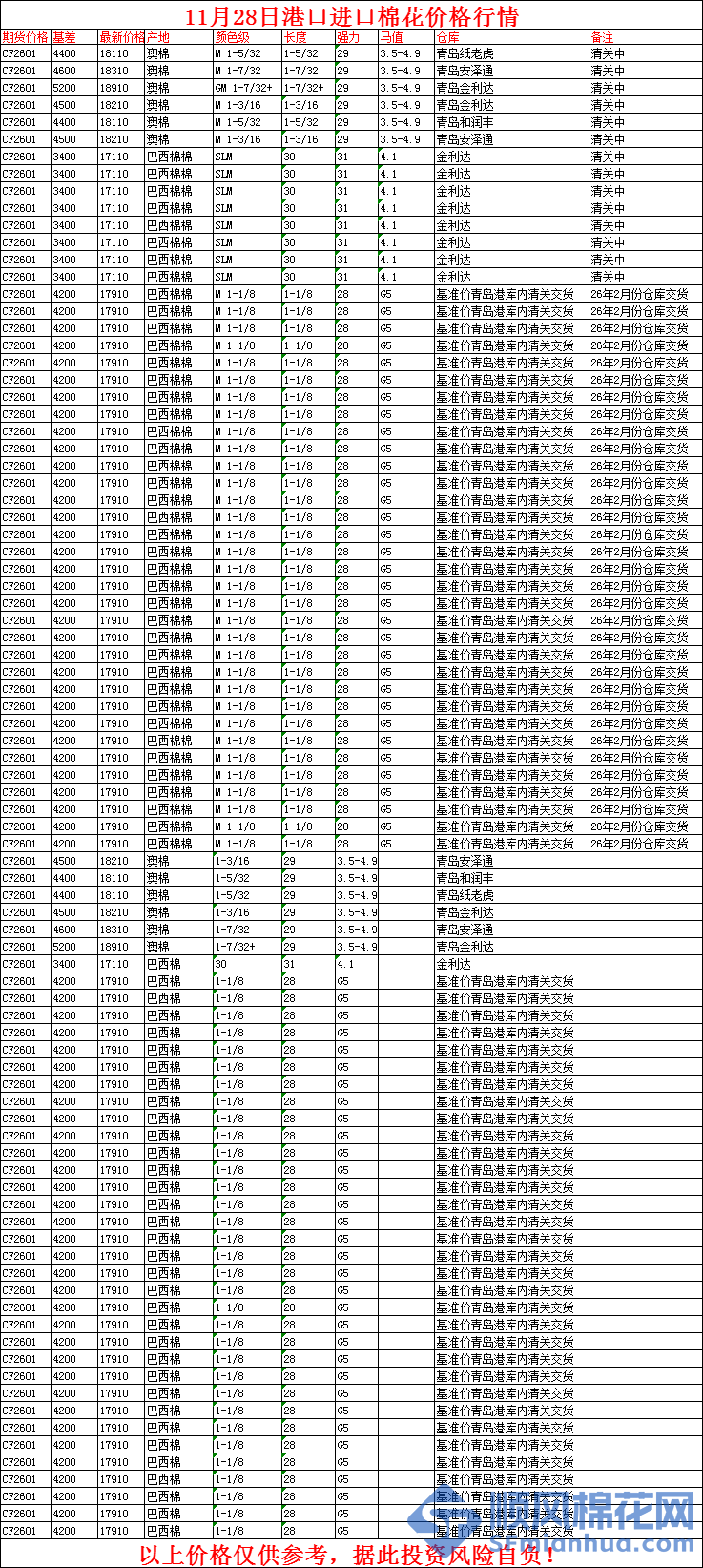 核心提示:11月28日港口进口棉花价格行情