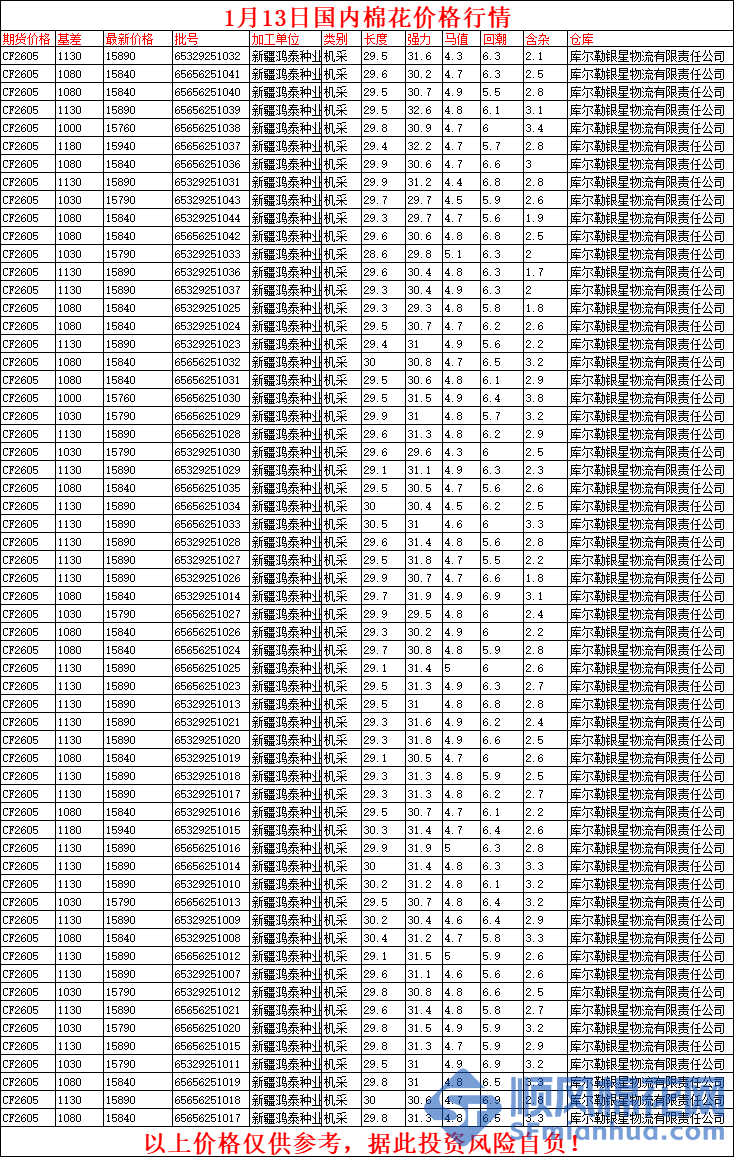 核心提示:1月13日国内棉花价格行情