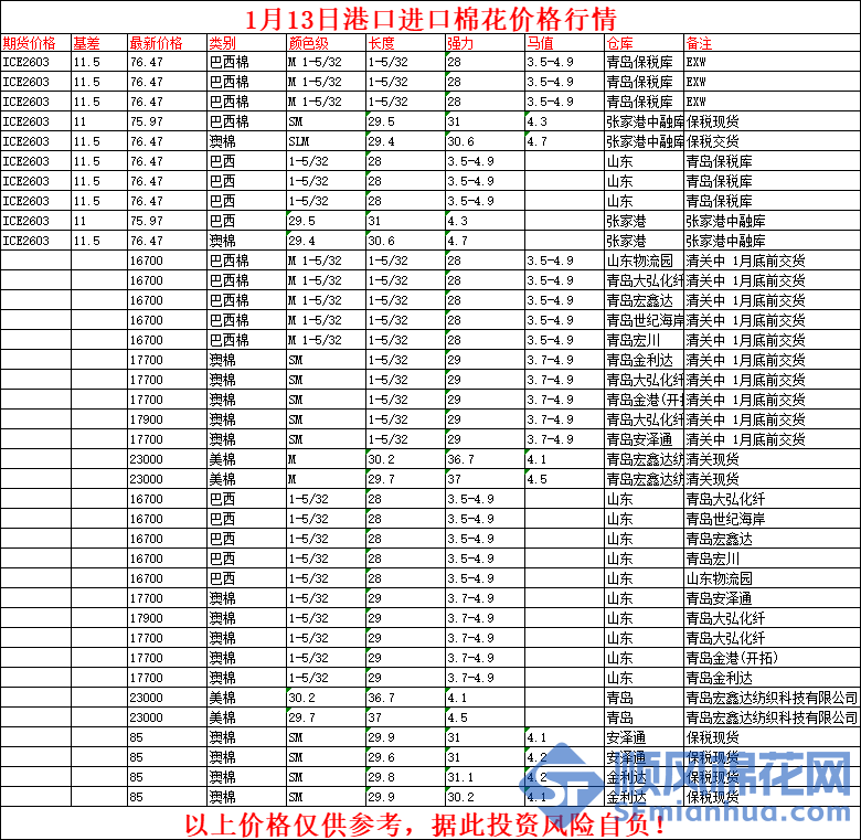 核心提示:1月13日港口进口棉花价格行情