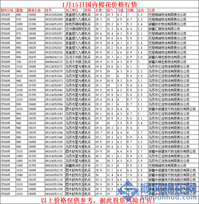 核心提示:1月15日国内棉花价格行情