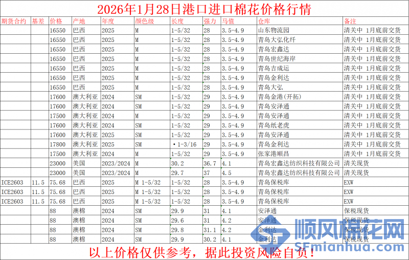 核心提示:1月28日港口棉花价格行情