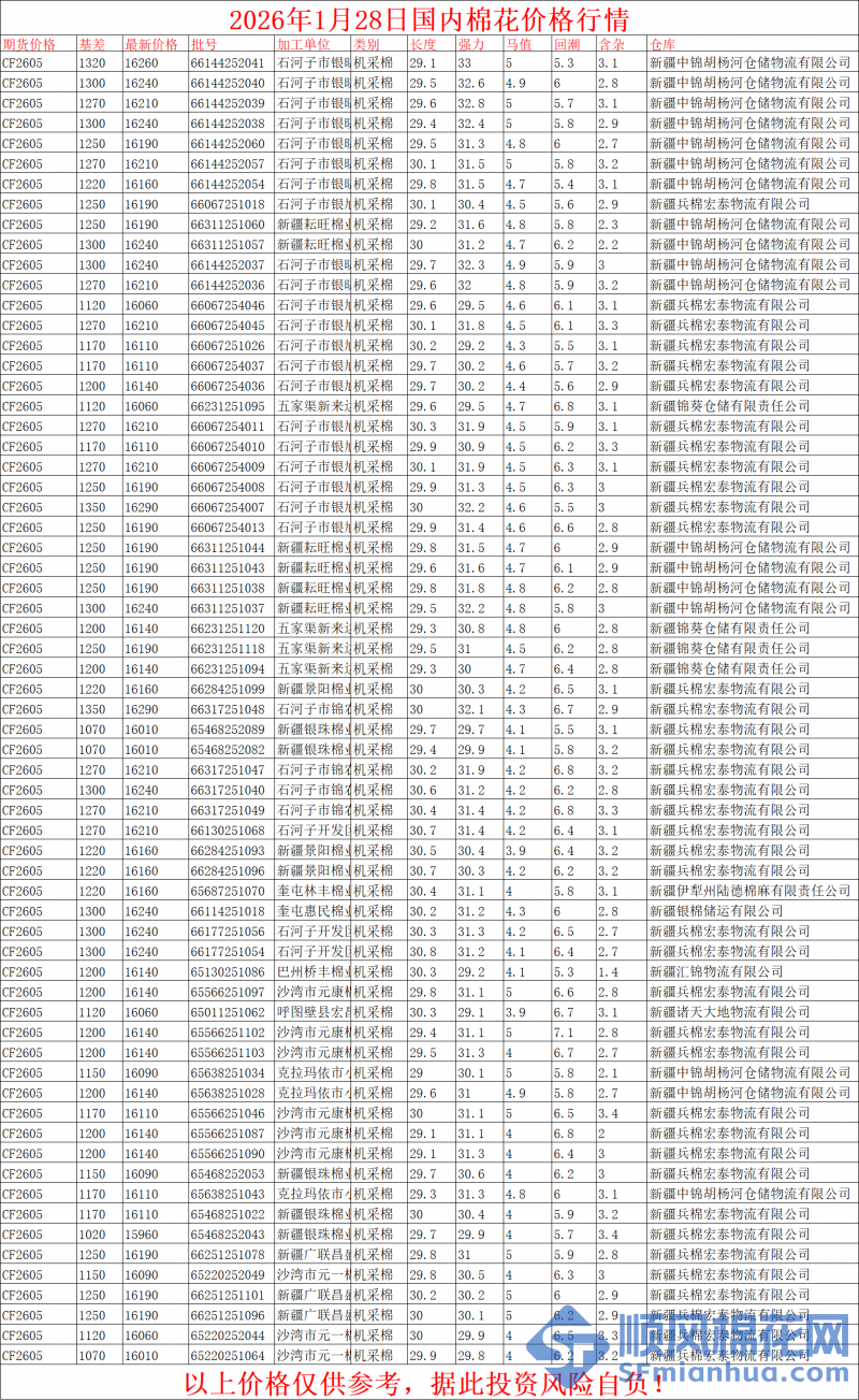 核心提示:1月28日国内棉花价格行情