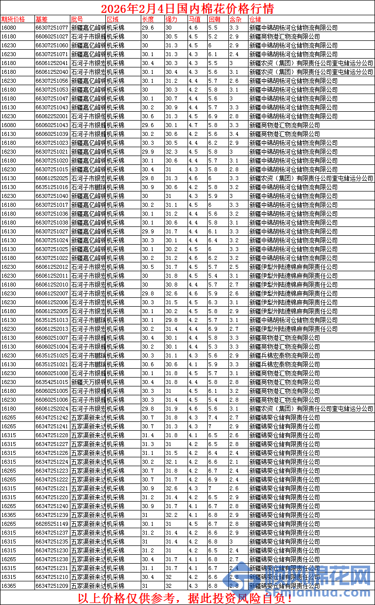 核心提示:2月4日国内棉花价格行情