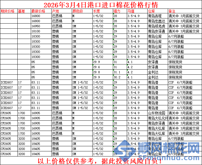 核心提示:3月4日港口进口棉花价格行情