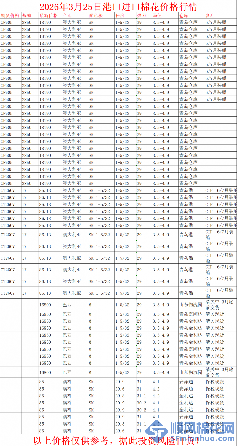 核心提示:3月25日港口棉花价格行情
