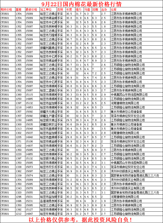核心提示:9月22日国内棉花价格行情