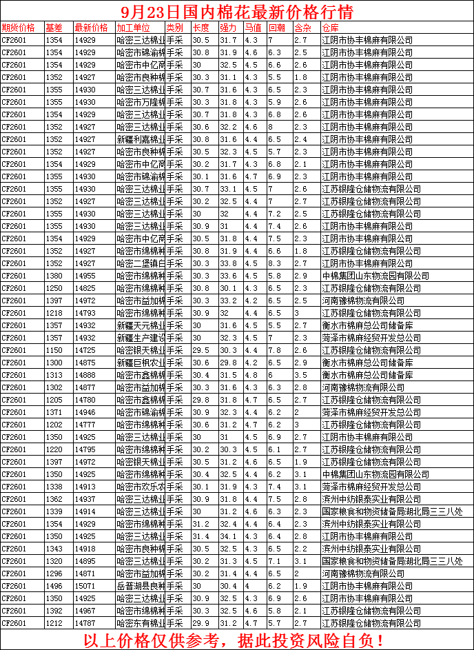 核心提示:9月23日国内棉花最新价格行情